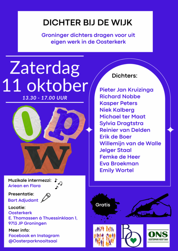 Op zaterdagmiddag 11 oktober 2025, van 13.30 tot 17.00 uur, vindt de derde editie van Dichter bij de Wijk plaats in de Oosterkerk.