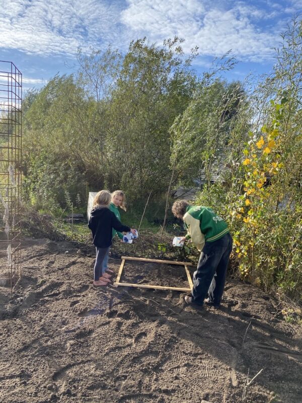 Met een speciaal raamwerk voor een vierkante meter maakten we het zaaien een stuk gemakkelijker. De zaadjes werden zorgvuldig afgewogen, zodat ze evenwichtig over het terrein konden worden verspreid. Zaaien maar!