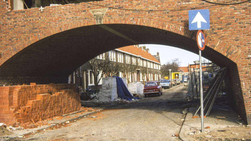 Bijschrift foto: Kamperfoeliestraat, poort tijdens renovatie, met sluitsteen met uil